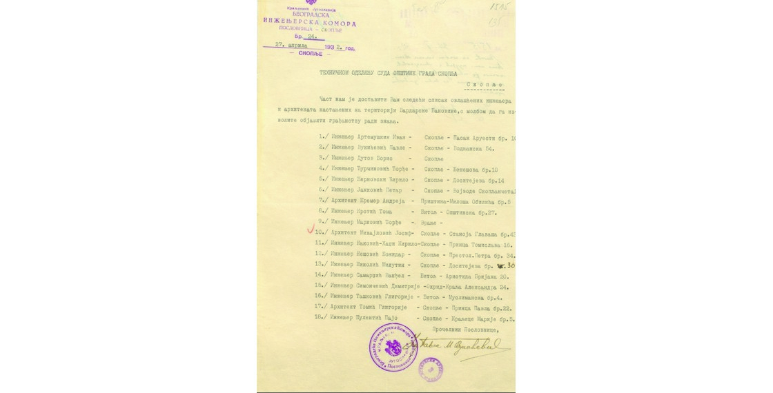 По имеющимся данным в 1920-х годах свое прибежище в Королевстве СХС в качестве беженцев нашли приблизительно 70 архитекторов и 1 200 инженеров из России. В Скопье остались около 50 архитекторов, инженеров, технических специалистов. Поскольку после трех войн (двух Балканских и Первой мировой) в стране наблюдался дефицит квалифицированных кадров, по прибытии многие архитекторы, инженеры, технические специалисты были приняты на работу в Технический и в Строительный отделы Общины города Скопье. Некоторые из них открыли свои собственные проектно-конструкторские бюро или основали артели, участвуя в открытых конкурсах на выполнение строительных работ.
