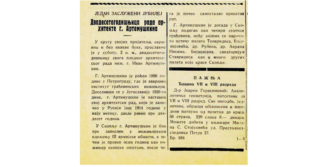 Иван Георгиевич (Егорович) Артемушкин спроектировал и возвел в Скопье в межвоенный период более 400 зданий (одно из них — так называемый Мавританский дом, уцелевший после землетрясения 1963 года, — является в настоящее время ностальгическим символом «старого» города). Но имя архитектора вследствие политических причин (обострения советско-югославских отношений в 1948 году) было надолго забыто. До сих пор неизвестны ни точные даты его рождения и смерти, ни место захоронения. Только выход в 2001 году книги известного архитектора Георгия Константиновского «Строители Македонии. XVIII–XX» вывел его из забвения.