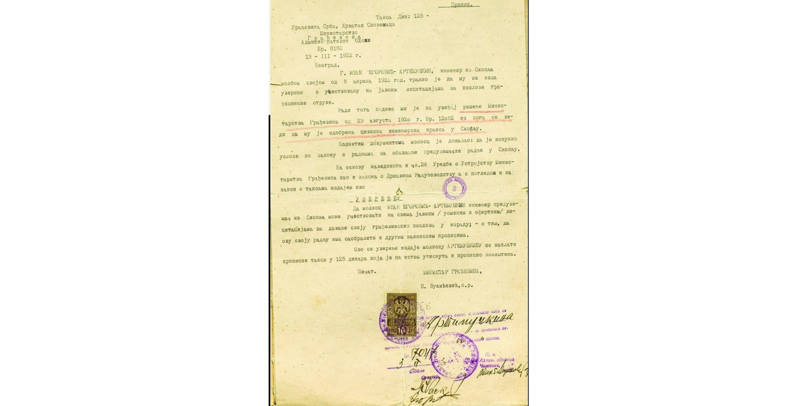 В 1930 году Артемушкин, зарегистрированный как сертифицированный инженер в Палате инженеров Королевства СХС, открыл свое собственное проектно-конструкторское бюро.