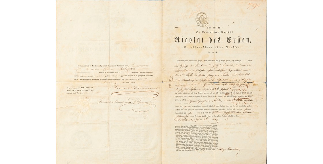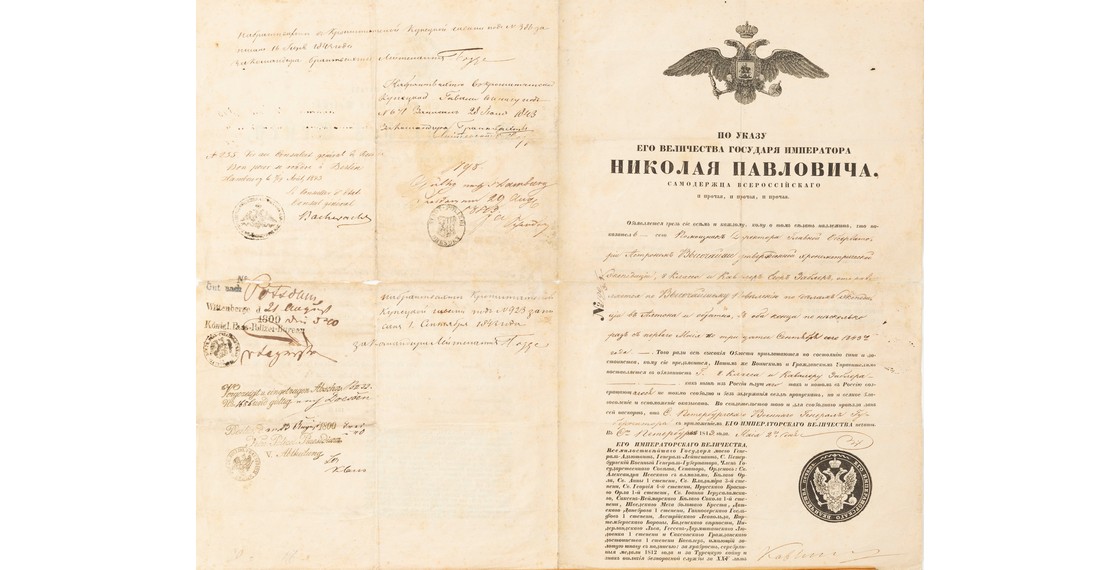 Паспорт помощника директора Главной обсерватории, астронома Егора Заблера для свободного проезда в Альтону (Германия) и обратно с 1 мая по 30 сентября 1843 года по делам хронометрической экспедиции. Российская империя, Санкт-Петербург. 2 мая 1843. Бумага, штемпельная краска, типографская печать, чернила. 41 × 52,5