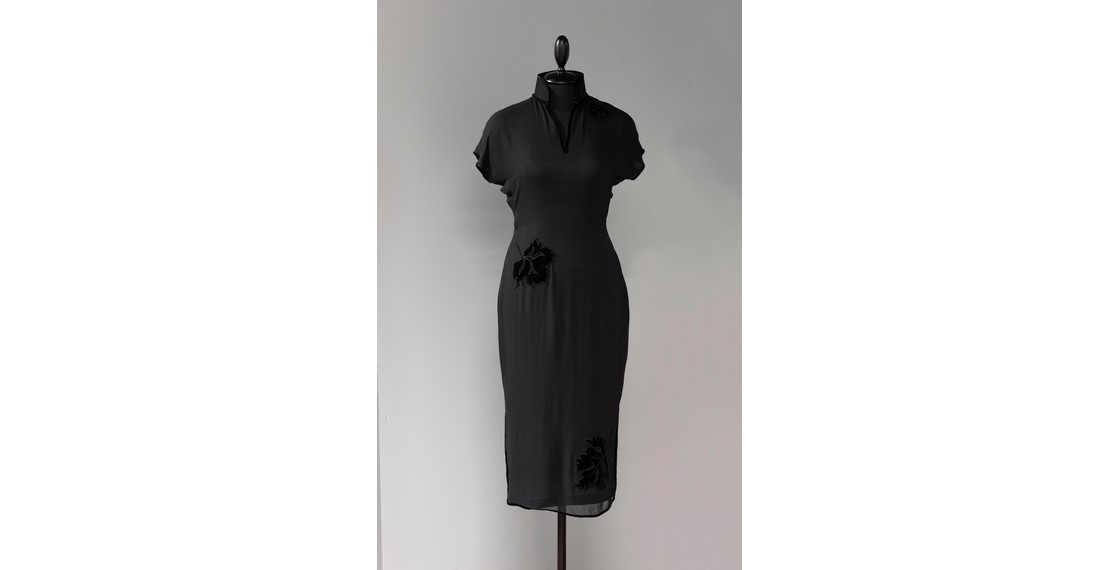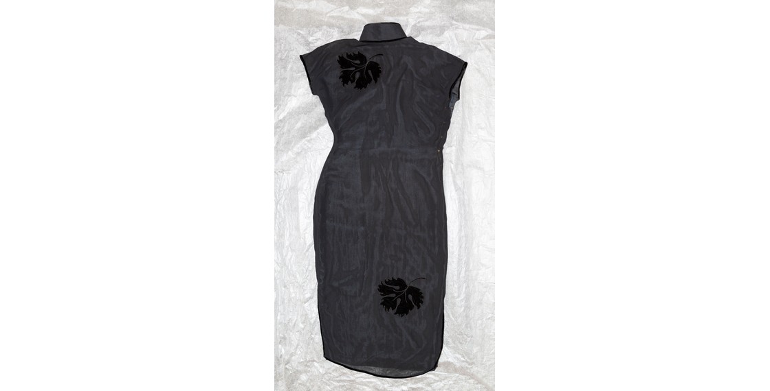 Платье женское вечернее. Узкое, черное, со спущенным коротким рукавом — «японкой», с остроугольным вырезом спереди и воротником-стойкой, с боковыми разрезами, на черной шелковой подкладке. Отделано черным бархатом: прорезные листья (пять аппликаций разного размера); кант на рукавах, воротнике, вырезе. Шанхай (Китай). 1940-е. Креп-сатин, бархат, шелк