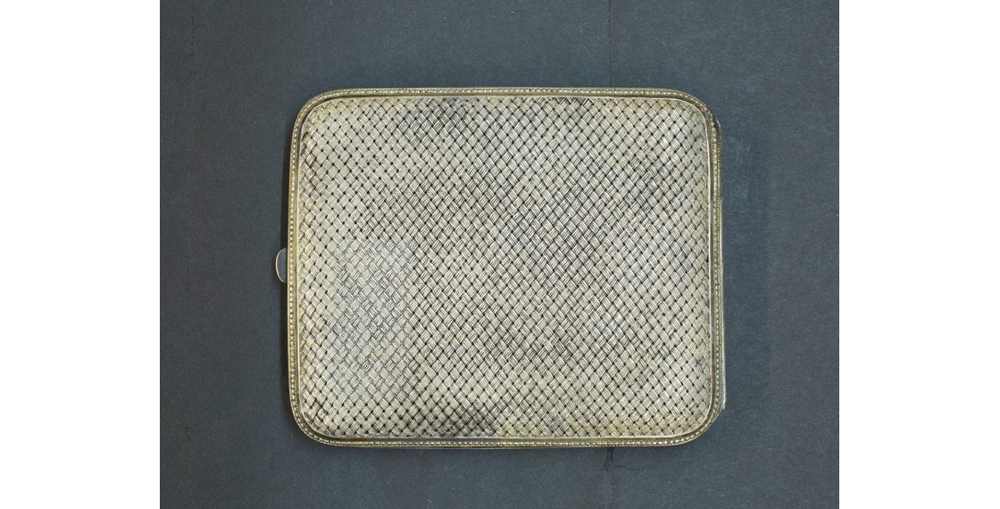 Портсигар мужской. Распашной, со скругленными углами, откидной крышкой, снабженной замком-защелкой. Оформление стенок стилизовано под рельефный плетеный орнамент. По периметру канта проложен орнаментальный поясок из бусин — «жемчужник». На внутренних стенках укреплены скобки для держателей сигарет. Российская империя. Начало XX века. Белый металл, литье, чеканка