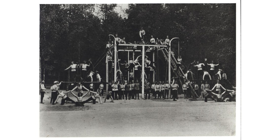 Юнкера 4-й роты Павловского военного училища на занятиях гимнастикой. Красное Село (Российская империя). 1913. 10,1 × 14,6