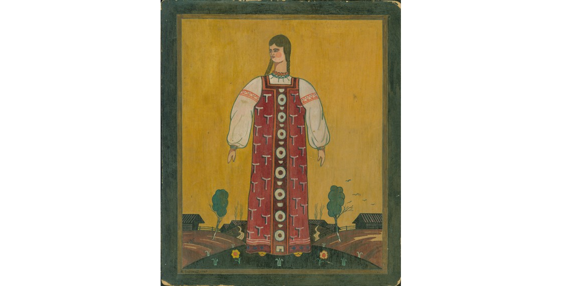 Ростислав Дмитриевич Сазонов. Девушка в красном сарафане. Германия. 1947. Картон, гуашь, лак. 29,9 × 25