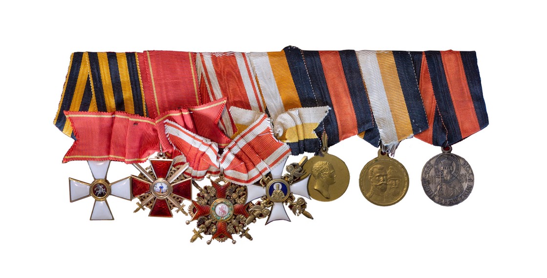 Боевые и памятные награды подполковника Русской императорской армии Л.В.Сейфулина. На колодке, слева направо: знак ордена Святого Георгия 4-й степени на ленте. Российская империя. 1915; знак ордена Святой Анны 3-й степени с мечами и бантом на ленте. Российская империя. 1916; знак ордена Святого Станислава 3-й степени с мечами и бантом на ленте. Российская империя. 1916; знак ордена Святителя Николая Чудотворца в память Великой войны на романовской ленте, с мечами и бантом. Шанхай. 1929–1938; Медаль в память 100-летия Отечественной войны 1812 года на ленте. Российская империя. 1912; медаль в память 300-летия царствования Дома Романовых на ленте. Российская империя. 1913; медаль в память 950-летия Крещения Руси на ленте. Шанхай. 1938
