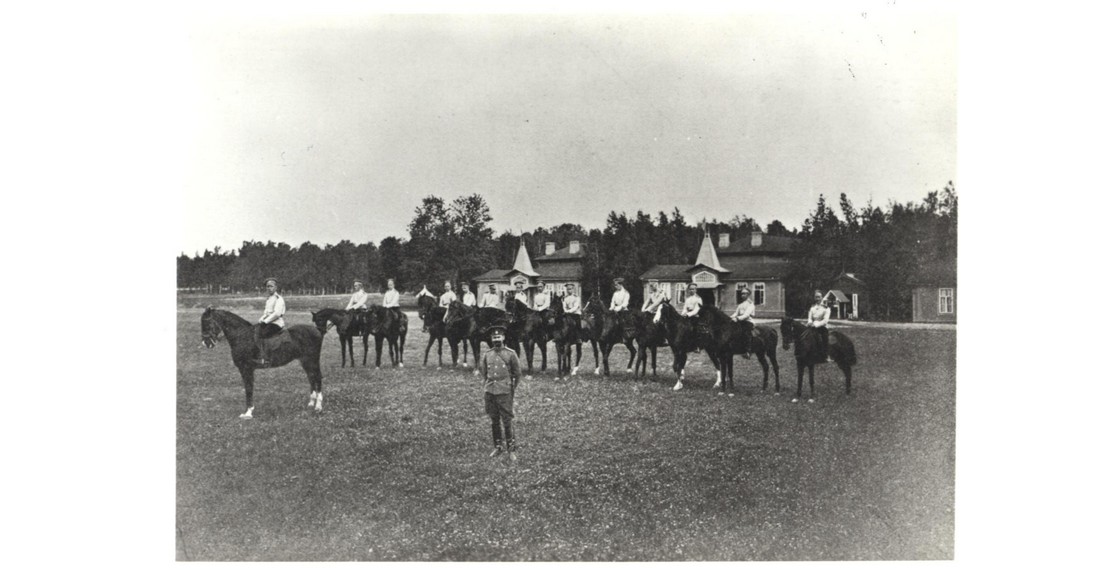 Юнкера Павловского военного училища на уроке верховой езды. Красное Село (Российская империя). 1913. 10,5 × 14,8
