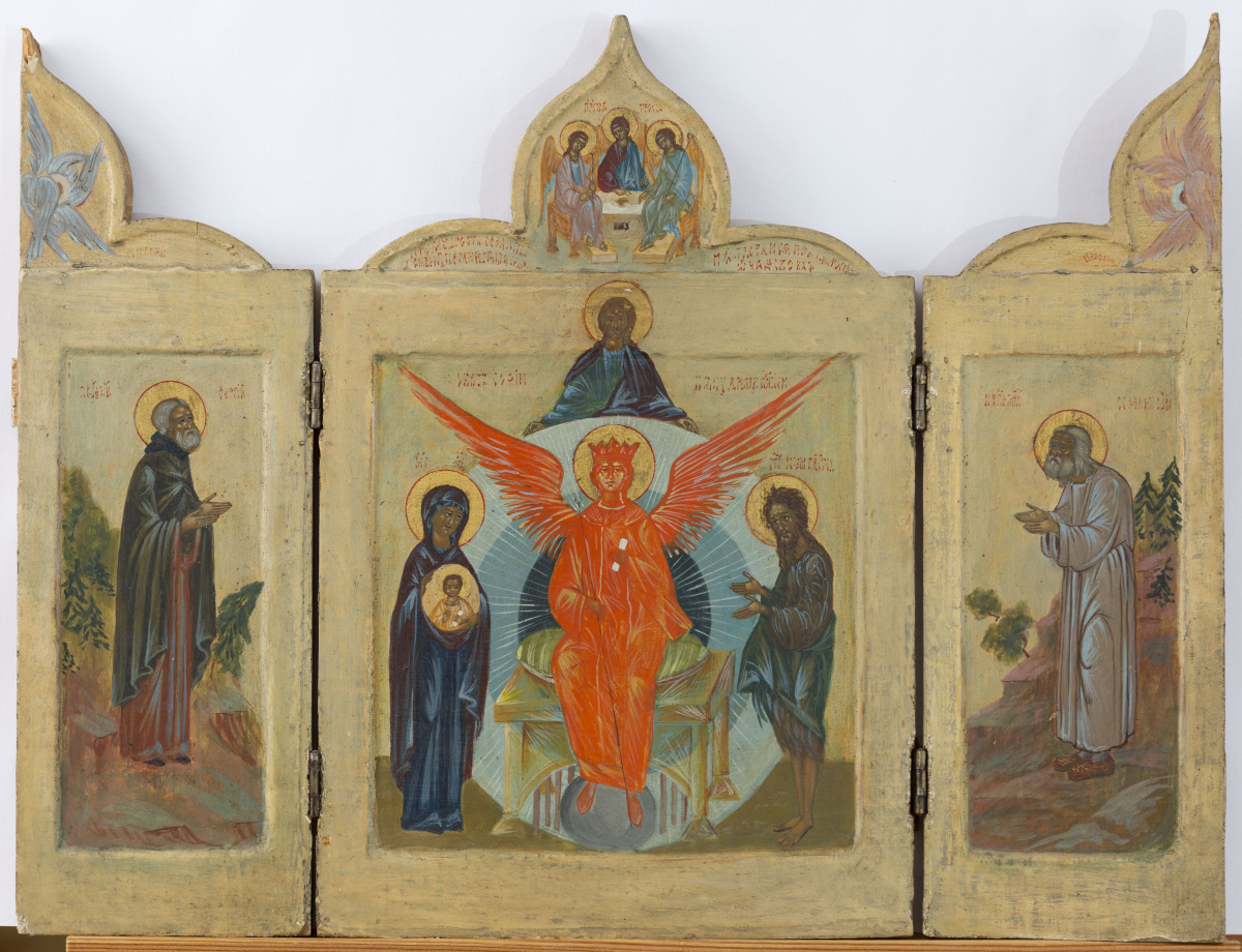 Трехстворчатый складень с изображением Софии Премудрости Божией с предстоящими Богородицей и Иоанном Крестителем на центральной створке, святого Сергия Радонежского и святого Серафима Саровского на левой и правой створках стал украшением фонда Юлии Николаевны Рейтлингер (1898–1988), чьи росписи и графика представлены в постоянной экспозиции нашего музея. Ю.Н.Рейтлингер написала эту миниатюрную композицию из трех икон в начале 1970-х годов по возвращении в СССР из эмиграции.