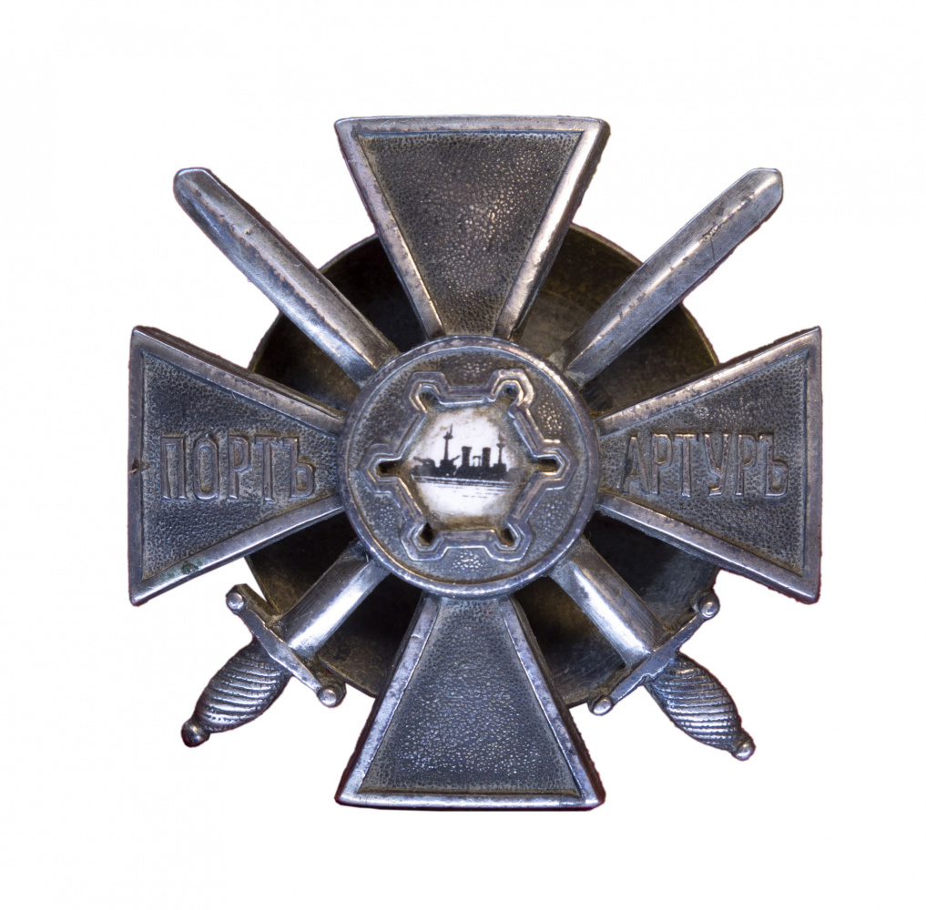Знак участника обороны Порт-Артура. Крест с расширяющимися концами, с полированным ободком и скрещенными в центре мечами рукоятями вниз. В центре круглого медальона — шестиугольник, представляющий в плане бастионную крепость, внутри которой на белом эмалевом фоне изображен черный броненосец. На горизонтальных лучах креста — рельефная надпись «Портъ-Артуръ». На винте с прижимной гайкой. На обороте — клеймо и проба. На гайке — клеймо «К.И.Бок / Морская 9 / Петроград». Российская империя. 1914–1917. Металл белый, эмаль
