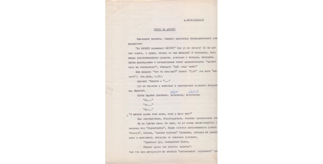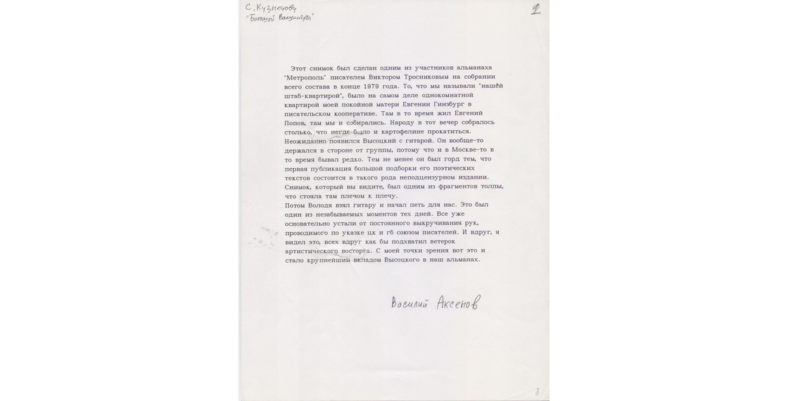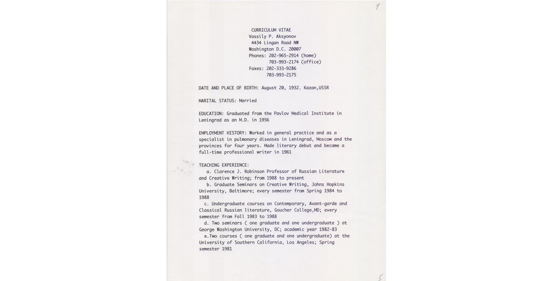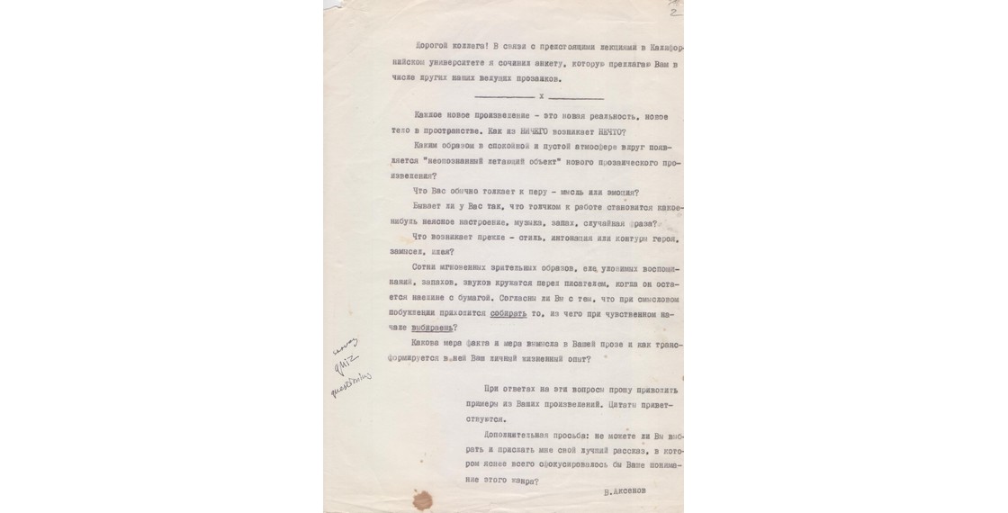 «В Вашингтоне за письменным столом у меня остается только один собеседник, В.П.Аксенов. В России слишком много собеседников, и я так или иначе стараясь им соответствовать, забалтываюсь. Сочинительство и эмиграция — довольно близкие понятия» (Аксенов В. [Без названия. «В Вашингтоне за письменным столом...»: Ответы для интервью З.Богуславской]. 1991. Автограф).