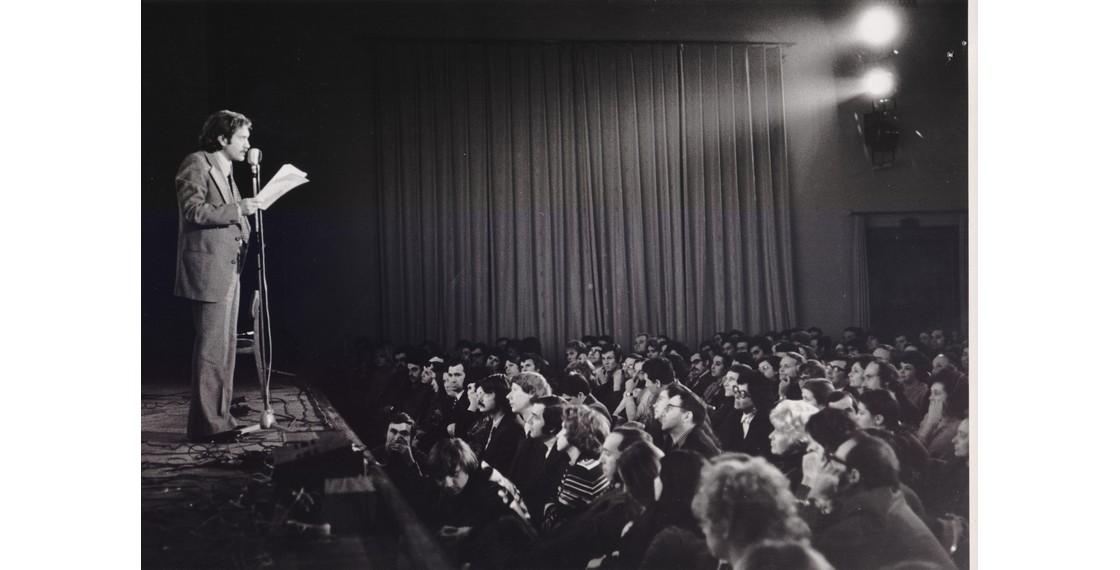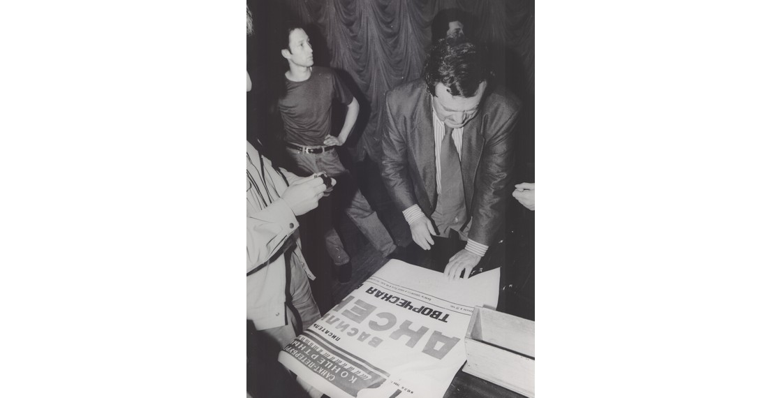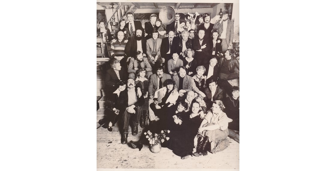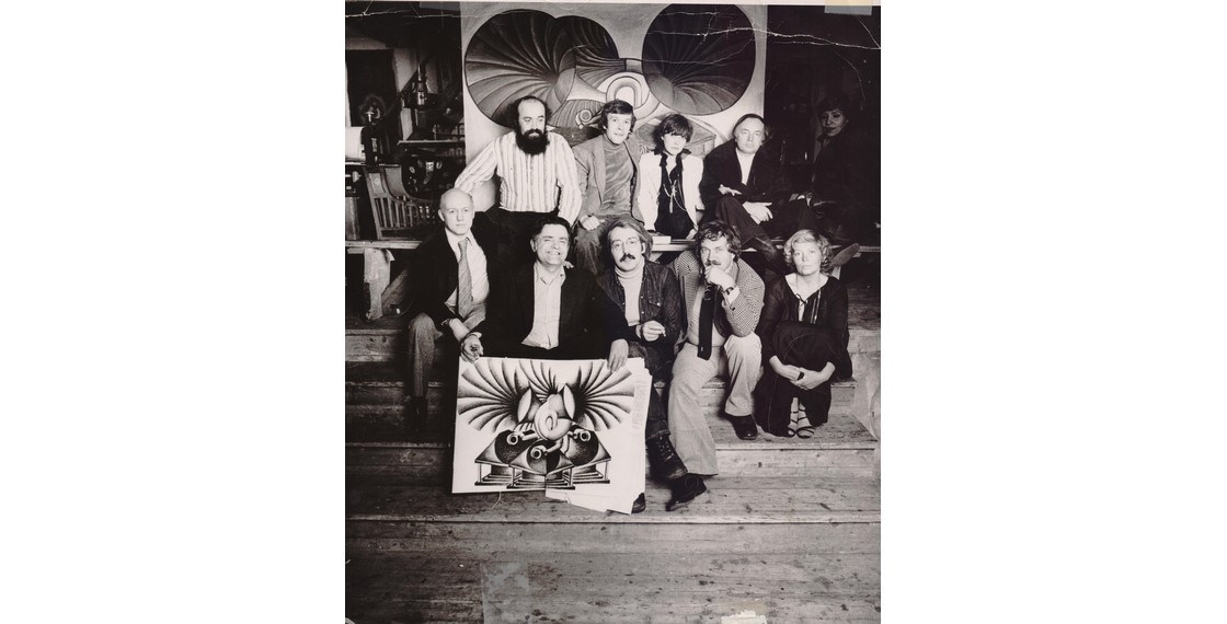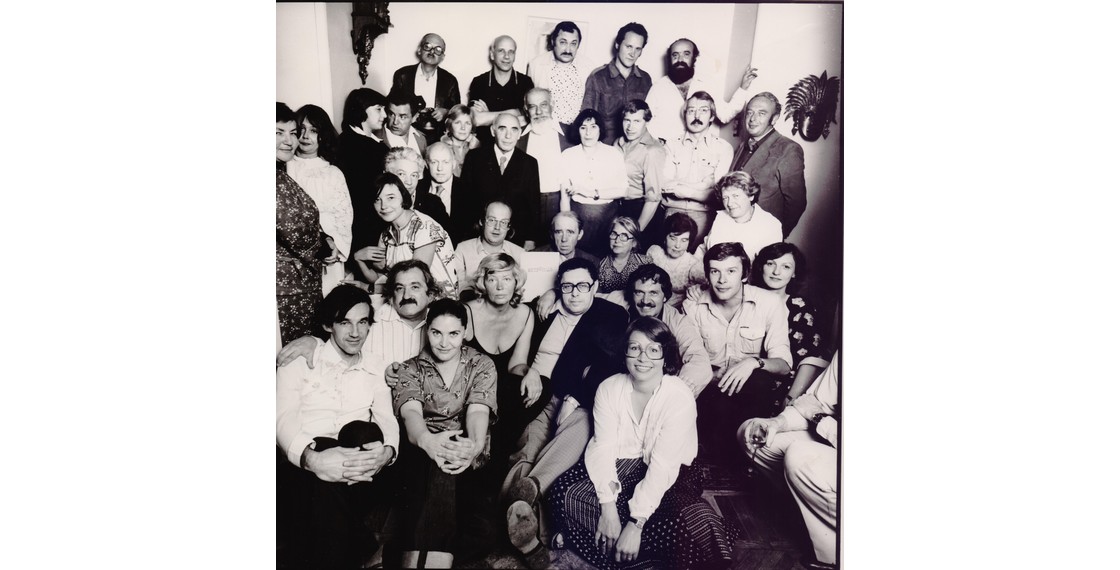 Участники «МетрОполя» в квартире Е.С.Гинзбург. Слева направо, сверху вниз: Б.Окуджава, В.Тростников, Ф.Горенштейн, В.Ракитин, Е.Попов, С.Бабенышева, Н.Кузнецова, С.Иванова, Ф.Искандер, О.Окуджава, С.Липкин, Л.Копелев, И.Лиснянская, Г.Владимов, А.Битов, Л.Баткин, В.Войнович, Б.Мессерер, Г.Балтер, Р.Белль (?), Г.Белль с «Метрополем» в руках, А.Белль, В.Славутская, Р.Орлова, Г.Сапгир, М.Кармен, Ю.Трифонов, В.Аксенов, Вик.Ерофеев, В.Скура, неустановленное лицо, О.Трифонова-Мирошниченко, Х.Уитни, К.Уитни. Фотография В.Плотникова. Москва. 1979