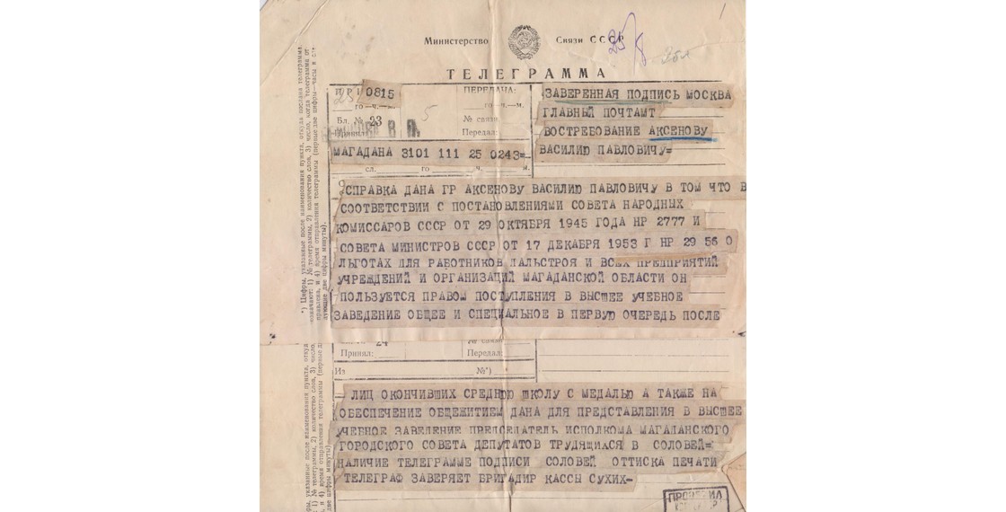 «Мамочка, ты пишешь, что эту страсть я унаследовал от тебя. Правильно, но это еще не все. Я мог бы никогда не узнать, что во мне живет эта страсть, если бы в 48 году не приехал в Магадан. Сейчас я особенно ясно понял это… И вот эти два переломных магаданских года, когда ты мне раскрыла совершенно новый мир, населенный какими-то чудаками, мечтателями, творцами. Ведь Блока, Маяковского, Сельвинского, Пастернака дала мне ты в эти два коротких года, и тогда затлел огонечек этой страсти» (Из письма В.П.Аксенова матери, Е.С.Гинзбург. Ленинград. 27 июля 1959).
