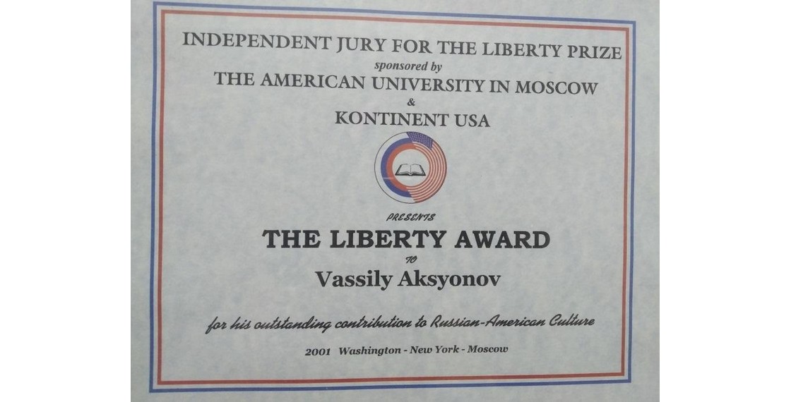 Диплом Премии свободы, присуждаемой независимым жюри, за выдающийся вклад В.П.Аксенова в русско-американскую культуру. Вашингтон, Нью-Йорк, Москва. 2001