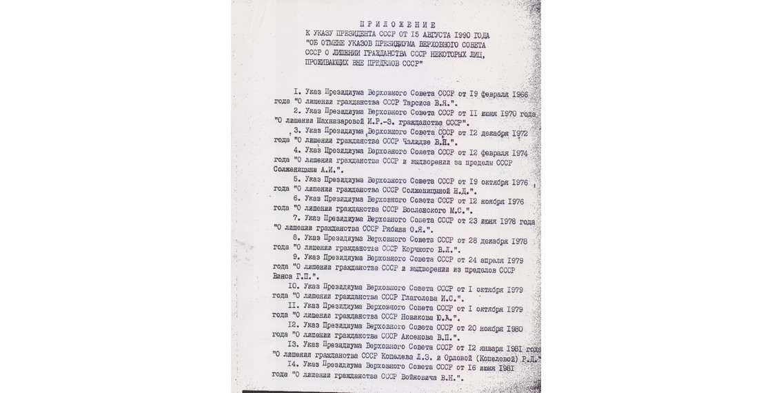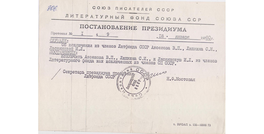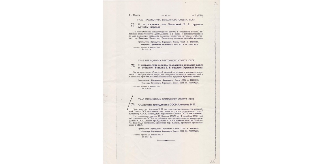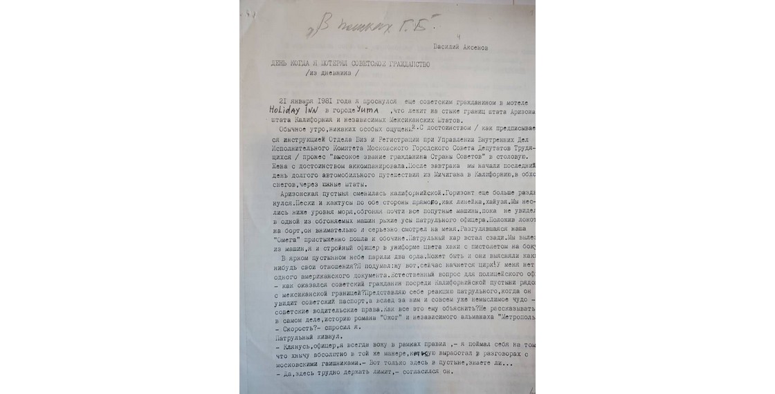 «Последняя забота родины — как бы чего лишнего с собой не увез нехороший писатель. Взяли толстую папку с записями, письмами, газетными вырезками. “Архив провозу не подлежит”. — “Если архив, как вы выражаетесь, провозу не подлежит, тогда я и сам никуда не поеду”, — сказал я. <…> Стало понятно, что верха дали добро на провоз “архива”, лишь бы архивариус поскорее убрался. Три месяца спустя после этой сцены указом Президиума Верховного Совета, подписанным Л.Брежневым, я был лишен советского гражданства за “систематический ущерб престижу Советского Союза”, за действия, “порочащие высокое звание Гражданина СССР”. Тогда казалось, что больше уже никогда не увижу родины» (Аксенов В. Десятилетие клеветы. Радиодневник писателя).