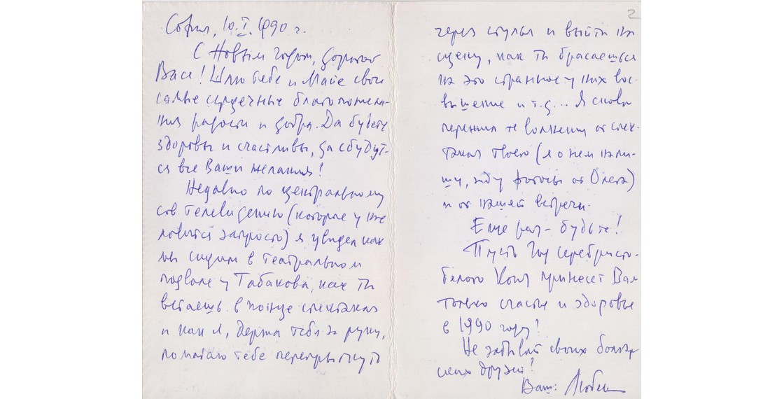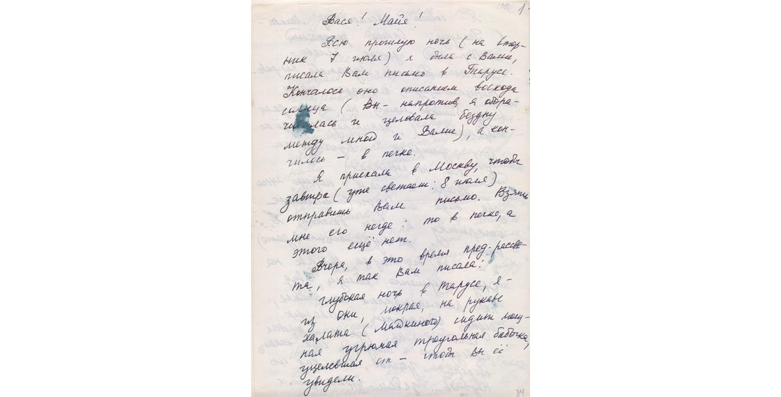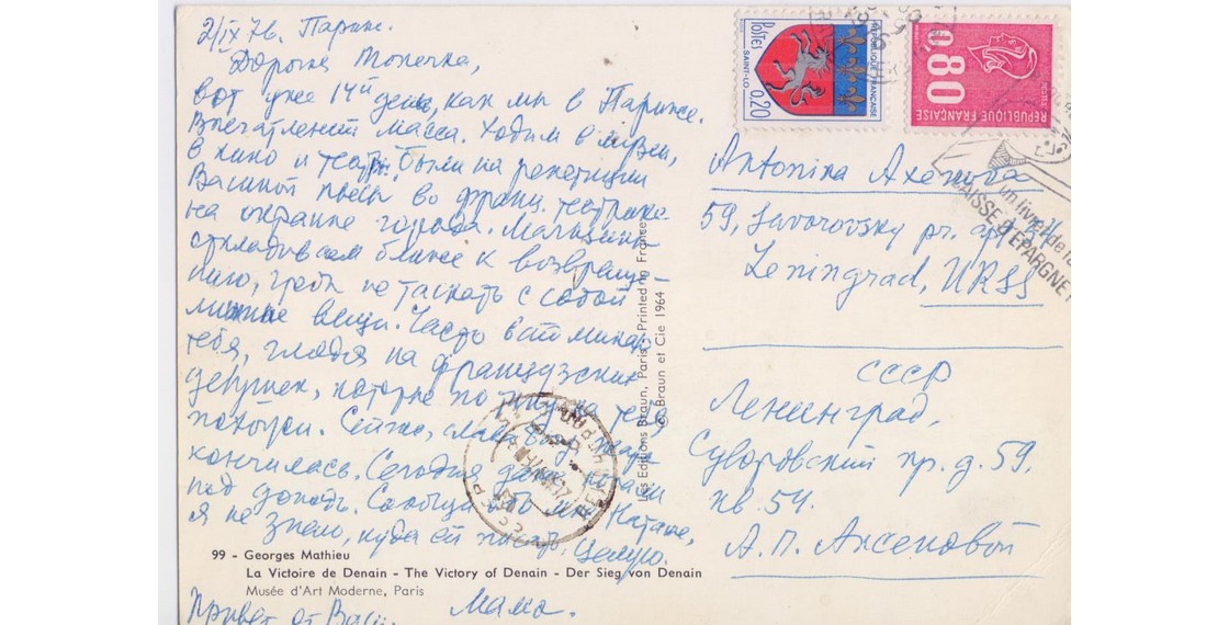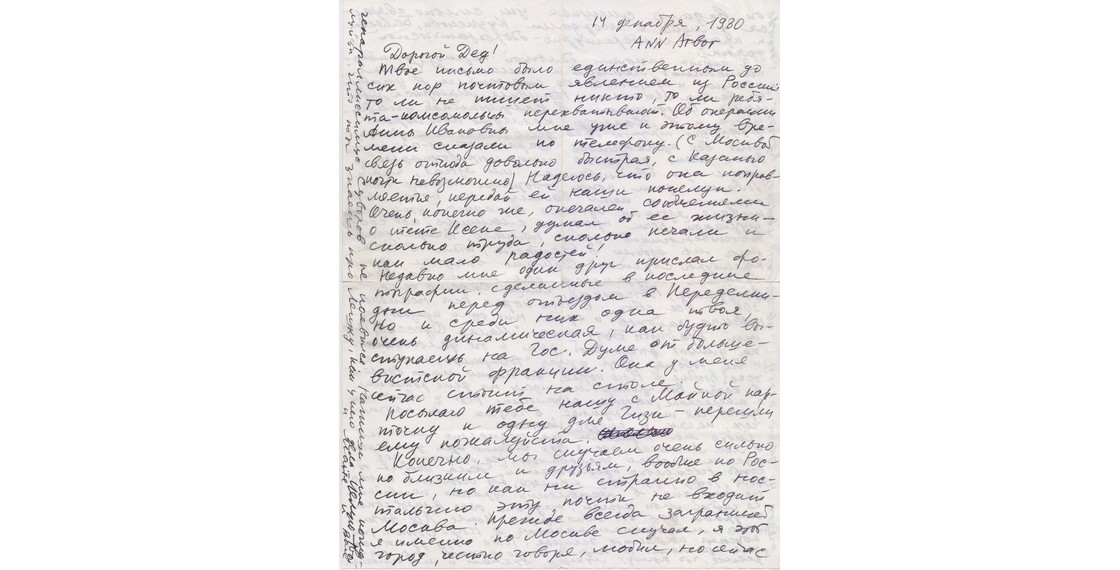 «Дорогой Дед! Твое письмо было единственным до сих пор почтовым явлением из России: то ли не пишет никто, то ли ребята-комсомольцы перехватывают. <...> Недавно мне один друг прислал фотографии, сделанные в последние дни перед отъездом в Переделкино, и среди них одна твоя, очень динамическая, как будто выступаешь на Гос. Думе от большевицкой фракции. Она у меня сейчас стоит на столе».