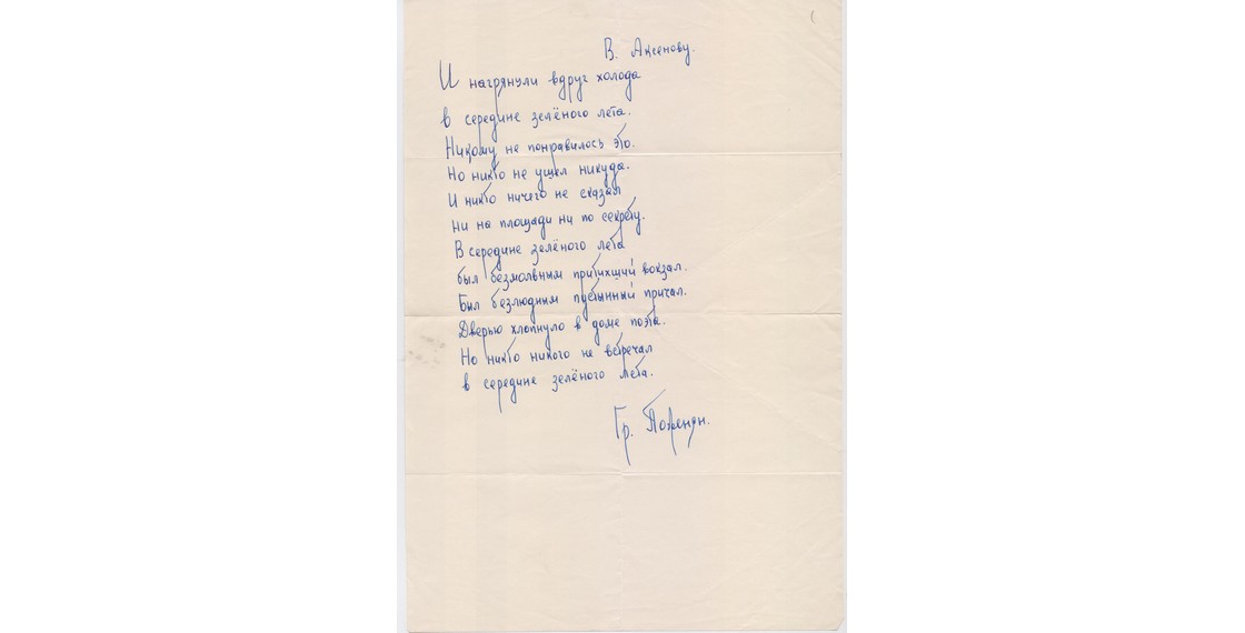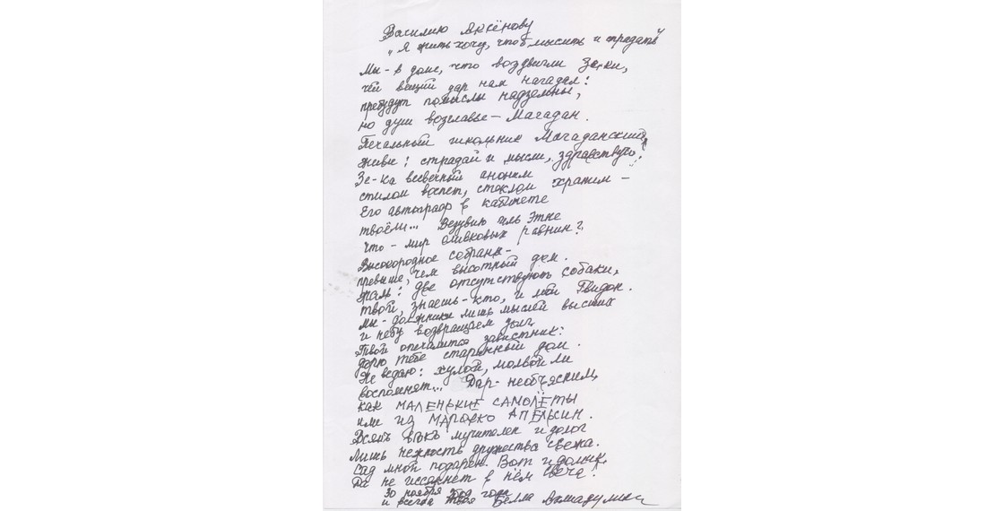 Автограф стихотворения Б.Ахмадулиной «Василию Аксенову». Москва. 30 ноября 2009