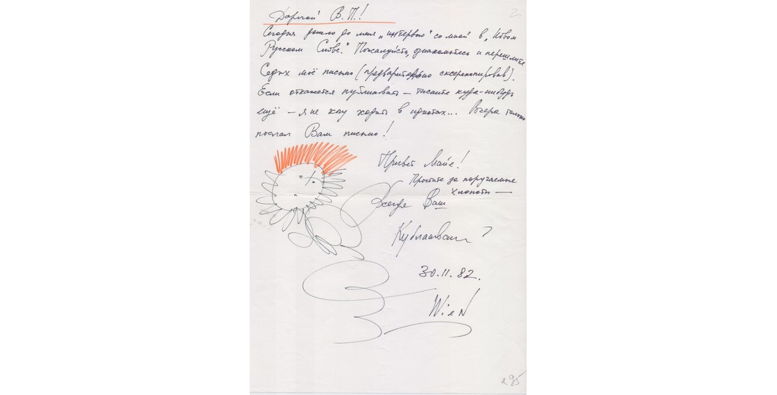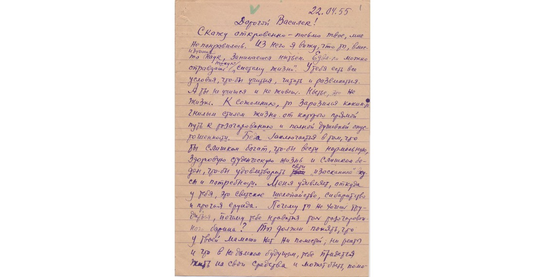 «Дорогой Василек! <...> К сожалению, ты заразился каким-то гнилым стилем жизни, от которого прямой путь к разочарованию и полной душевной опустошенности. <...> Меня удивляет, откуда у тебя это светское шалопайство, сибаритство и прочая ерунда».