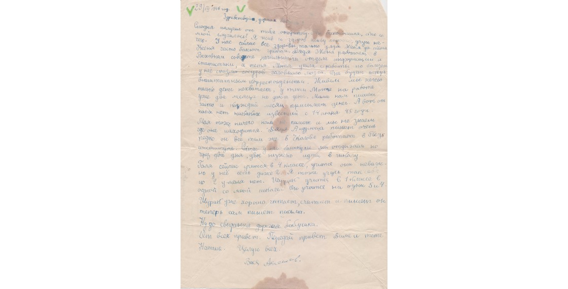 «Живем мы нечего только денег нехватает, у тети Моти на работе уже два месяца не дают денег. Мама нам пишет часто и каждый месяц присылает денег. А вот от папы нет никаких известий с 14 июня 45 года». (Орфография сохранена.)