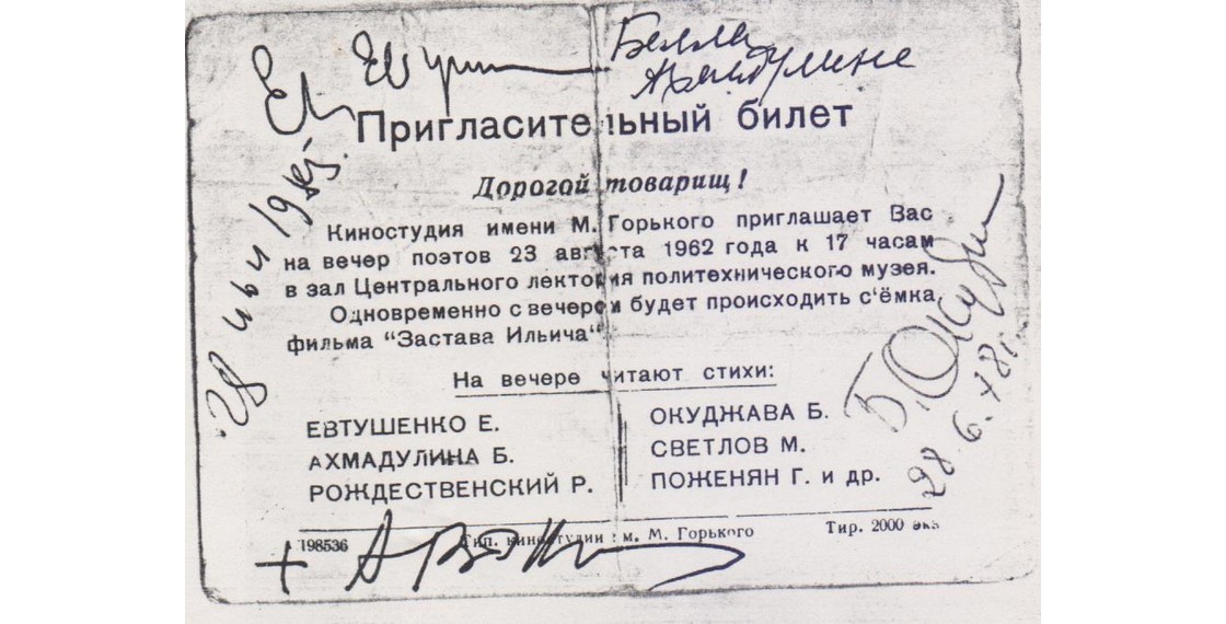 «И все расселись как сидели, чтобы позировать то ли в первой, то ли в последней “коллективке” этого поэтического поколения. И в западной части небосвода полыхнула большая зарница — снимок сделан!» (Аксенов В. Таинственная страсть. Роман о шестидесятниках).