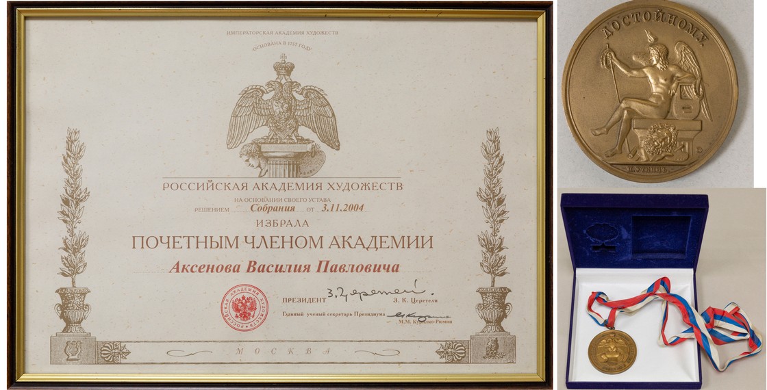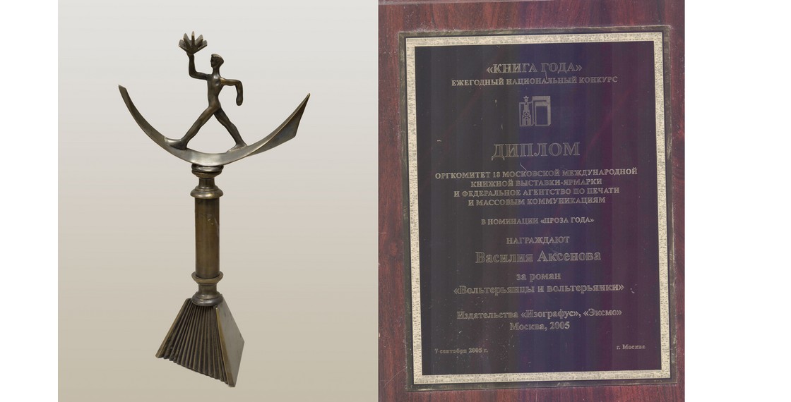 Диплом и кубок ежегодного национального конкурса «Книга года», которыми В.П.Аксенов был награжден за роман «Вольтерьянцы и вольтерьянки». Москва. 2005