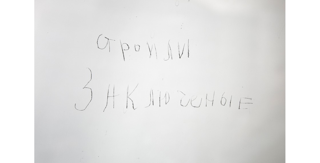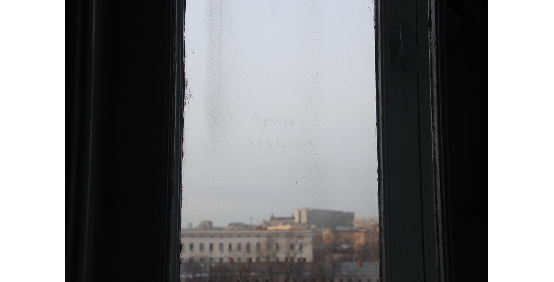 Надпись: «Строили заключенные», процарапанная на стекле окна в квартире В.П.Аксенова. Москва. Начало 1950-х. (В строительстве высотки на Котельнической набережной в 1948–1954 годах принимали участие заключенные ГУЛАГа)