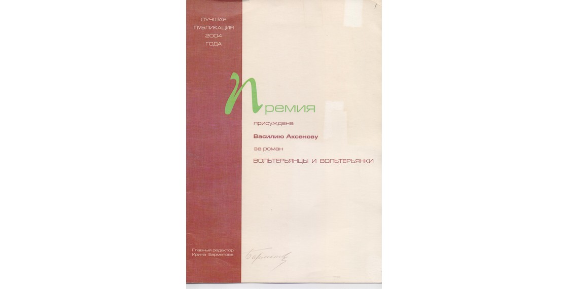 Диплом премии «Лучшая публикация 2004 года» за роман В.П.Аксенова «Вольтерьянцы и вольтерьянки». Москва. 2004