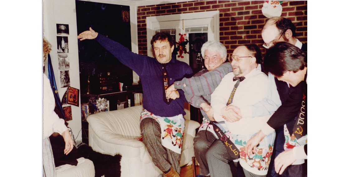 В.П.Аксенов, В.Н.Войнович и другие в шуточной пляске с самодельными галстуками. Фотография Ф.Губаева. США. Декабрь 1989