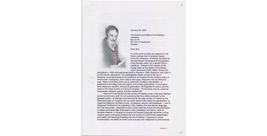 Заявка в Нобелевский комитет о присвоении премии в области литературы В.П.Аксенову, подготовленная профессором русской литературы Университета Джоржа Мейсона Джулией Кристенсен (Julie A. Christensen). Фэрфакс (США). 28 января 2005