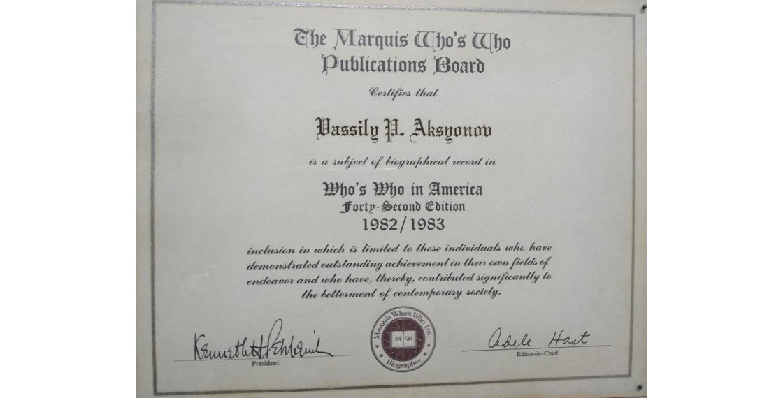 Свидетельство о включении В.П.Аксенова в издание Who’s Who in America за 1982–1983 годы, выданное издательским советом компании Marquis Who’s Who, Inc. США. 1983