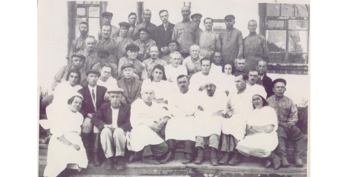 Е.С.Гинзбург (1-я слева во 2-м ряду), А.Я.Вальтер и заключенные врачи и медработники лагерного медпункта госпиталя ГУЛАГ на Колыме. Поселок Беличье. 1944