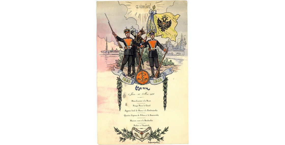 Меню праздничного обеда 5 июня 1933 года по случаю 250-летия Императорской Гвардии: Преображенского и Семеновского полков и 1-й батареи Лейб-Гвардии 1-й артиллерийской бригады, ведущих старшинство от формирования царем Петром Алексеевичем «потешных». Значимость события побудила заказать типографское меню по оригинальному рисунку П.П.Дмитрова. В названиях блюд продолжается шуточная традиция, отсылающая к событиям Северной войны: «похлебка “Петр Великий”», «семга из Нарвы по-Преображенски», «четверть ягненка из Полтавы по-Семеновски», «стручковая фасоль по-Бомбардирски»