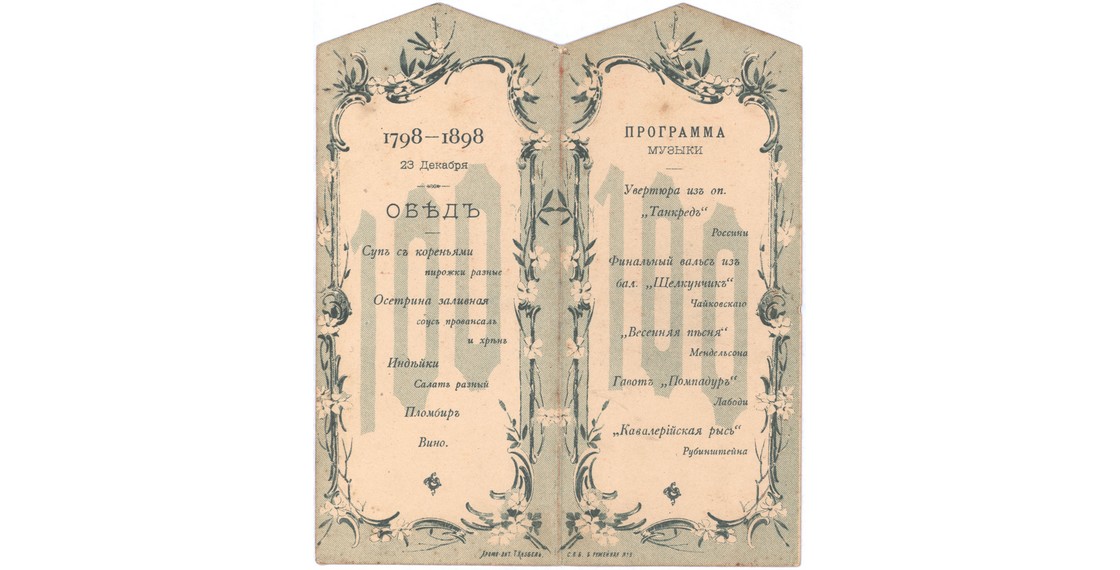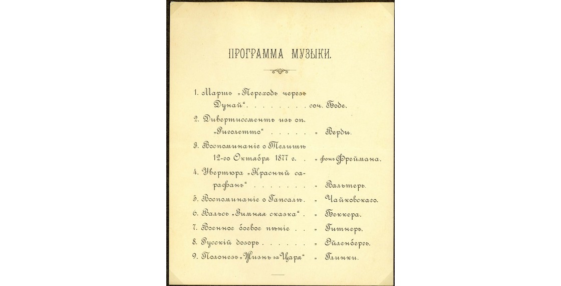 Помимо меню (перечня блюд), элементом праздничных застолий были и музыкальные программки, — как в данном случае на торжественном обеде в Гвардейской конно-артиллерийской бригаде, посвященном 25-летию боя под Телишем во время Русско-турецкой войны 1877–1878 годов (об этом напоминает и музыкальное «Воспоминание о Телише» в программе). Санкт-Петербург, 12 октября 1902
