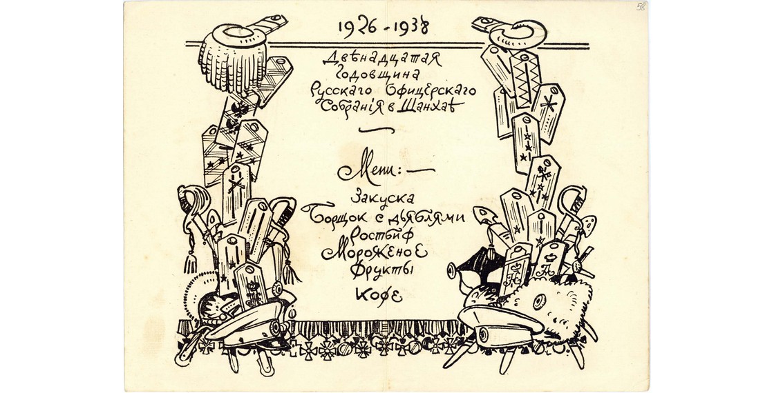 В отличии от предыдущего рукописного меню с простеньким рисунком, это нарисовано профессиональным художником и отпечатано в типографии. Руководство русского Офицерского собрания в Шанхае — одного из организационных и культурных центров военной эмиграции — заказало рисунок для меню праздничного обеда по случаю двенадцатилетия собрания поручику Г.А.Сапожникову, получившему в 1930-е годы международную известность под псевдонимом «Sapajou» как карикатурист и автор комиксов. В оформлении меню он собрал большинство предметов военной экипировки, которые приобретали для русских изгнанников уже значение символов: генеральские, адмиральские, штаб- и обер-офицерские погоны и эполеты, драгунскую и уланскую каски, фуражки и папахи, сабли, кинжалы и кортики, длинный ряд орденов и медалей…