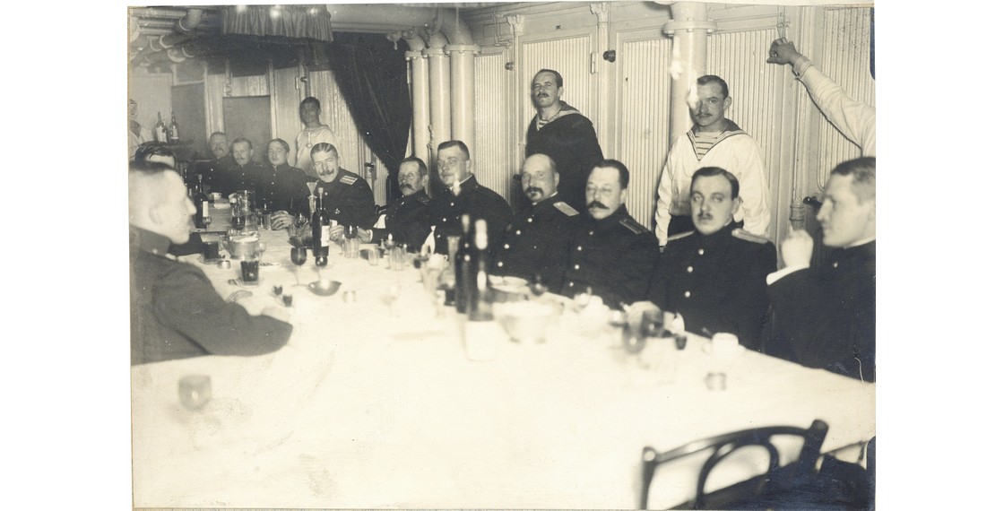 Общее застолье в кают-компании броненосного крейсера «Россия». На больших кораблях кают-компании по богатству и комфортабельности могли сравниться с собраниями Гвардейских полков. Из альбома К.В.Шевелева, в 1913–1914 годах занимавшего должность старшего офицера «России»