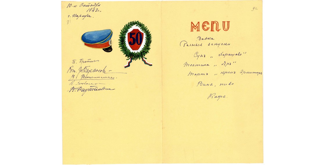 Меню обеда 10 октября 1943 года в честь пятидесятилетия производства в первый офицерский чин бывшего командира Сумского гусарского полка, генерала П.П.Гротена (изображенную здесь полковую фуражку он считал «самой красивой» и некоторое время продолжал носить ее, уже командуя другим полком). «Яр» и «Эрмитаж» в названиях блюд напоминают о знаменитых московских ресторанах, местах отдыха гусарских офицеров в мирное время