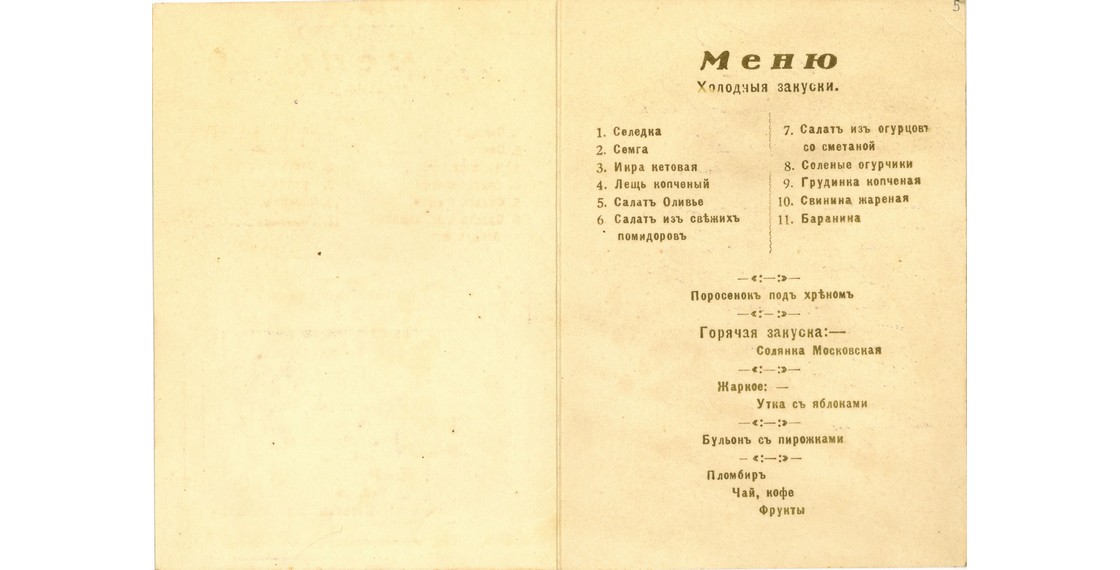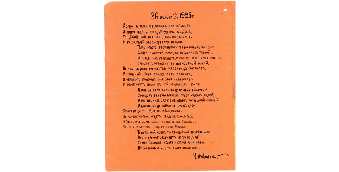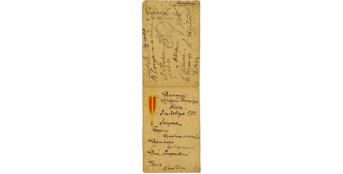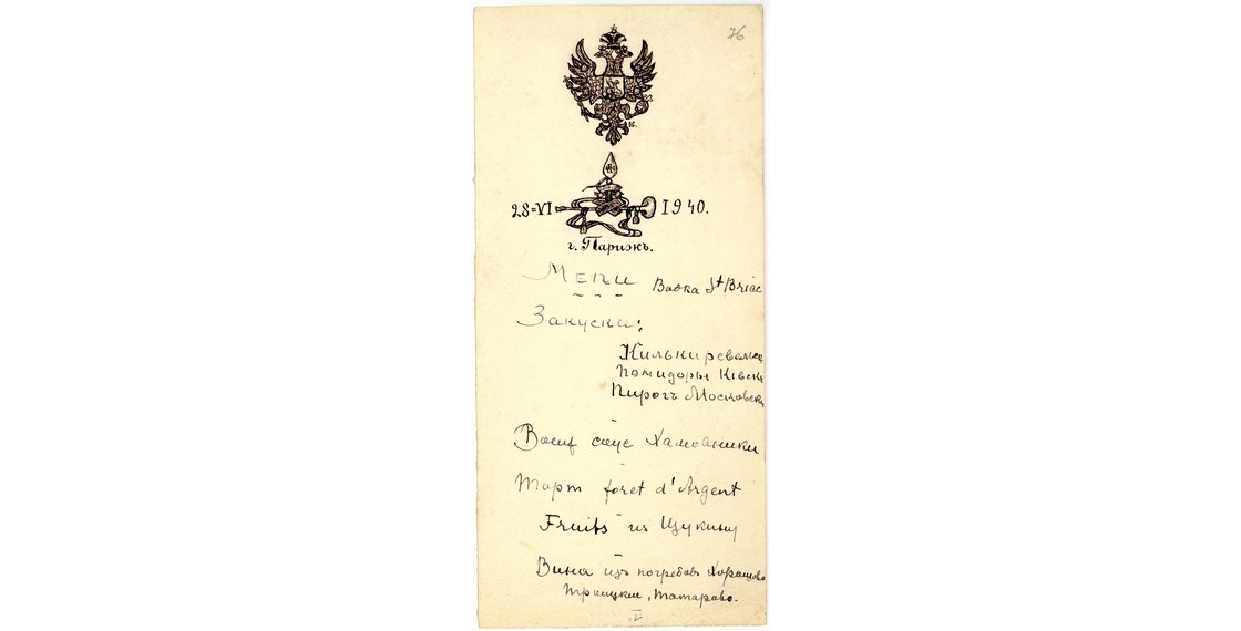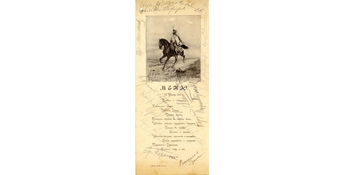 В собрании Дома русского зарубежья находится не очень много тех памятников военных застолий, которые относятся к временам дореволюционным. Но сегодня они особенно дороги, как, вероятно, были дороги и тем, кто в чемодане беженца или в офицерской полевой сумке увозил на чужбину меню праздничных обедов, музыкальные программки или фотографии, напоминавшие о мирном времени, о стоянках на старых квартирах своих славных полков и батарей, о друзьях, многие из которых, возможно, уже отдали свои жизни в борьбе за Россию, — о потерянной родине.