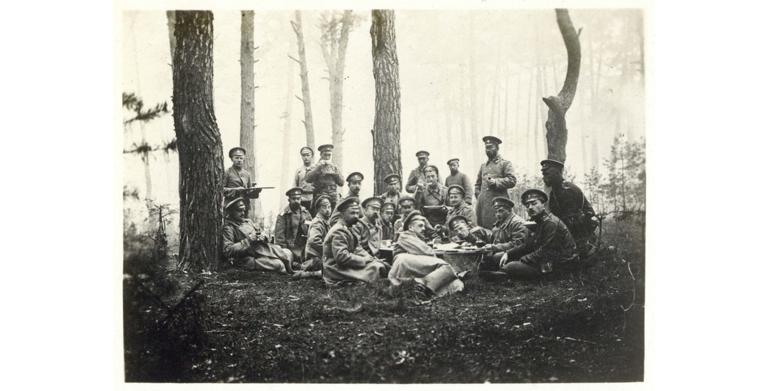 В отличие от героев предыдущей фотографии, которые все-таки сидят за столом и едят из хорошей посуды, офицерам Лейб-Гвардии 1-го стрелкового Его Величества полка пришлось расположиться на завтрак просто в лесу. Ноябрь 1914