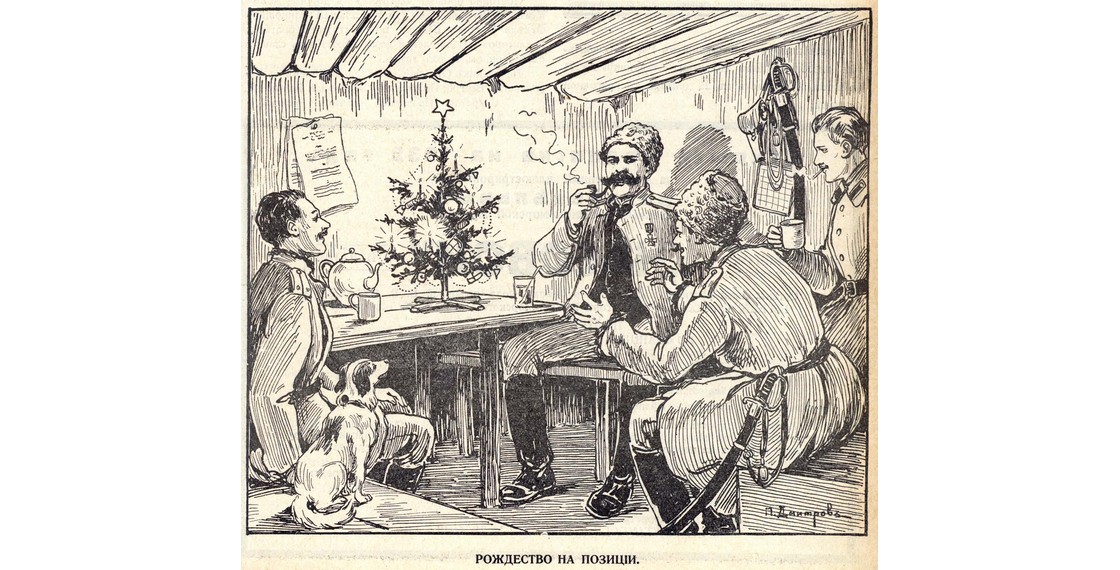 Рождество на позиции. Рисунок П.П.Дмитрова — профессионального художника и коренного офицера Лейб-Гвардии Гусарского Его Величества полка — был опубликован в 1931 года в журнале «Часовой» — главном органе русской военной эмиграции
