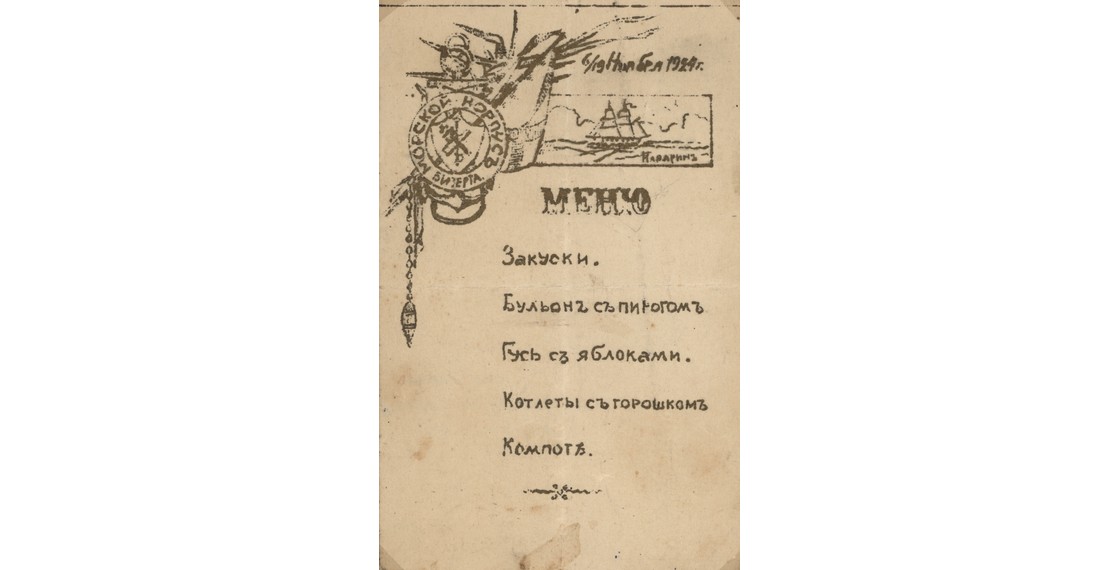 Меню последнего праздничного обеда Морского корпуса в Бизерте (Северная Африка) в день корпусного праздника 6 (19) ноября 1924 года (в мае 1925 года корпус был закрыт). Помимо герба корпуса (шпага, увенчанная короной, корабельный руль и градшток — инструмент для определения высоты светил над горизонтом) и очевидной морской символики (русский Андреевский флаг, якорь), обращает на себя внимание рисунок брига «Наварин», модель которого украшала зал Морского корпуса на Васильевском острове в Санкт-Петербурге. На бизертинском меню «Наварин» изображен плывущим, что, возможно, символизирует странствия кадет и гардемарин, заброшенных судьбою далеко от России