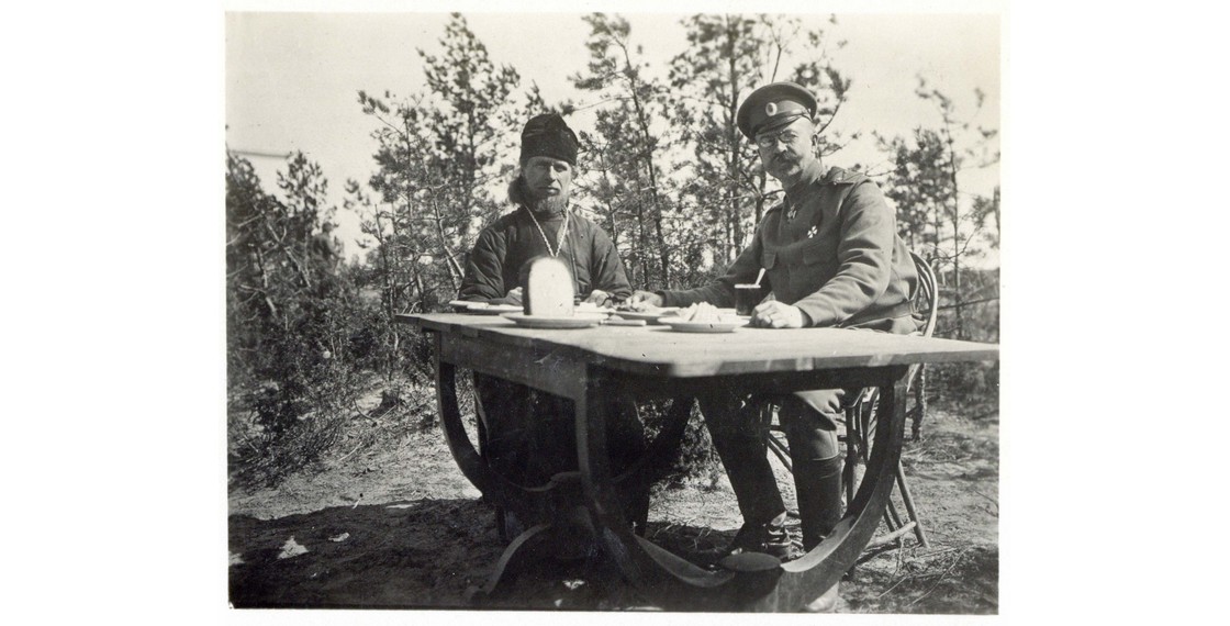 Командир Лейб-Гвардии 1-го стрелкового Его Величества полка генерал Э.Л.Левстрем и исполняющий обязанности полкового священника иеромонах Ниловой Столбенской пустыни Амвросий (Матвеев) за скромной Пасхальной трапезой (на столе виден разрезанный пополам кулич). Оба стали на этой войне кавалерами ордена Святого Георгия, отец Амвросий — посмертно. Март 1915