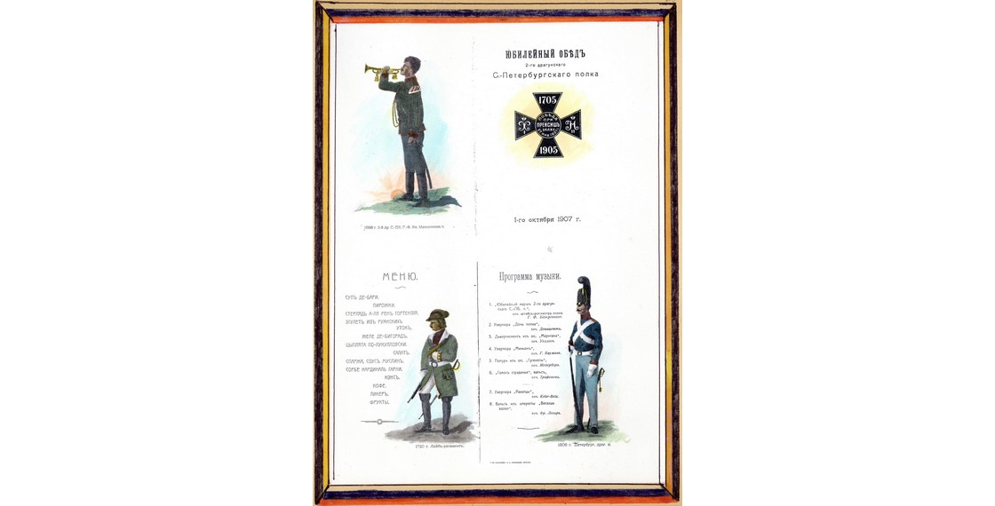 Меню юбилейного обеда с музыкой в честь двухсотлетия со дня сформирования 2-го драгунского (с конца 1907 года — 1-го уланского) Санкт-Петербургского (с 1914 года — Петроградского) генерал-фельдмаршала князя Меншикова полка. На рисунках — полковой знак и солдаты полка в разные периоды его существования. Фотокопия с подлинного меню была сделана в эмиграции и раскрашена старыми уланами для альбома, посвященного истории своего полка