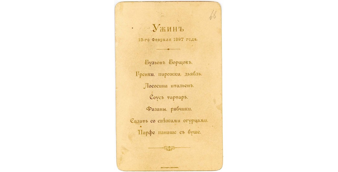 Наверное, мы уже никогда не узнаем, кто из офицеров 1-го гусарского Сумского полка (в 1897 году он был еще драгунским и носил номер 3, как видно на изображенном погоне рядового) сохранил это меню ужина в полковом собрании и чем ему был памятен и дорог именно день 13 февраля 1897 года. Но в эмиграции оно бережно хранилось старыми гусарами как память о мирном прошлом полка и традиционном московском хлебосольстве. Москва, 1897