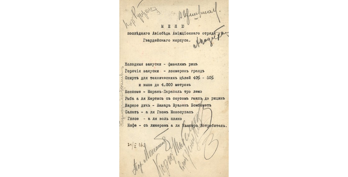 С военных лет сохранилось намного меньше, чем от мирного времени, меню даже праздничных застолий, и тем ценнее такая «вещественная» память о фронтовом обеде авиационного отряда Гвардейского корпуса 24 апреля 1916 года. Названия блюд — шуточные: «Моран-Парасоль», «Кертис», «Вуазен» и «Ньюпор» — типы аэропланов, «Гном-Моносупап» — тип авиационного двигателя, фюзеляж и лонжерон — элементы конструкции аэропланов, «а ля воль плянэ» — «на бреющем полете», а в официальных требованиях на выдачу спирта обычно подчеркивалось, что он нужен исключительно «для технических целей»