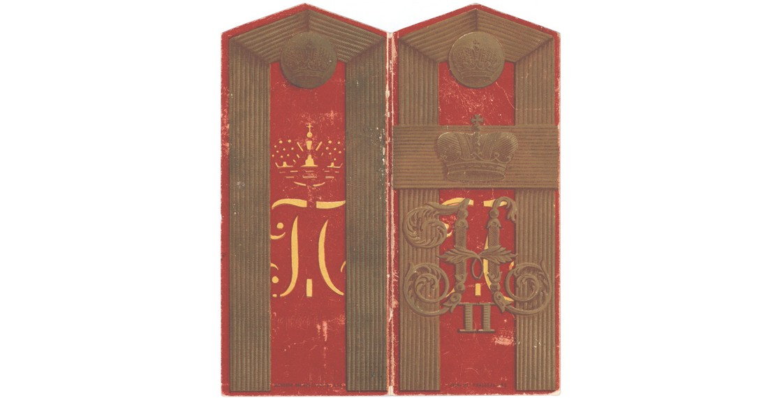 Меню праздничного обеда с музыкой в день столетия 1-го военного Павловского училища, оформленное в виде юнкерского погона. Столичное училище могло позволить себе заказать на юбилей меню в хорошей типографии. Санкт-Петербург, 1898