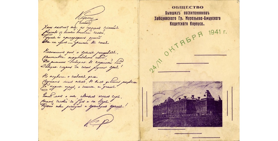 Меню торжественного застолья в день храмового праздника Хабаровского кадетского корпуса 11 (24) октября (память Святого Апостола Филиппа) 1941 года в Шанхае. Сонет «Кадету» августейшего поэта К.Р. — великого князя Константина Константиновича, главного начальника военно-учебных заведений, «отца всех кадет», горячо ими любимого, — словами «ты не один — орлиная вас стая!» продолжал подбадривать и на чужбине, а фотография корпусного здания в Хабаровске напоминала об утраченной родине