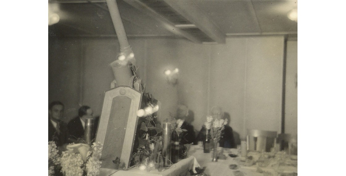 В тех случаях, когда собирались на праздник не в ресторане, а в «своих стенах», русские воины старались соответственным образом «оформить» помещение. Видно это и на фотографиях праздничных застолий в доме Общества русских ветеранов Великой войны в Сан-Франциско: офицеры и выпускники Читинского военного училища украсили стены макетами училищного нагрудного знака и юнкерского погона, а участники «артиллерийского обеда» водрузили на стол гильзы и макеты снарядов и даже небольшую пушку. Сан-Франциско, 1935