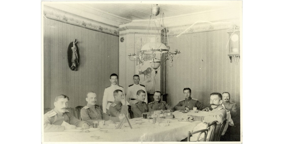 Более скромное провинциальное полковое собрание (20-й драгунский Финляндский полк, Вильманстранд — Великое княжество Финляндское) накануне Первой мировой войны. В белых гимнастерках — прислуга собрания; на стене — чучело, сделанное из охотничьего трофея кого-то из офицеров