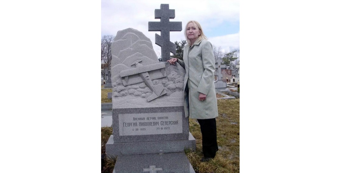 Диана Прокофьева-Северская, дочь А.Н.Прокофьева-Северского, у могилы своего дяди. Ново-Дивеево (США). 2010-е. Архив И.Павловой