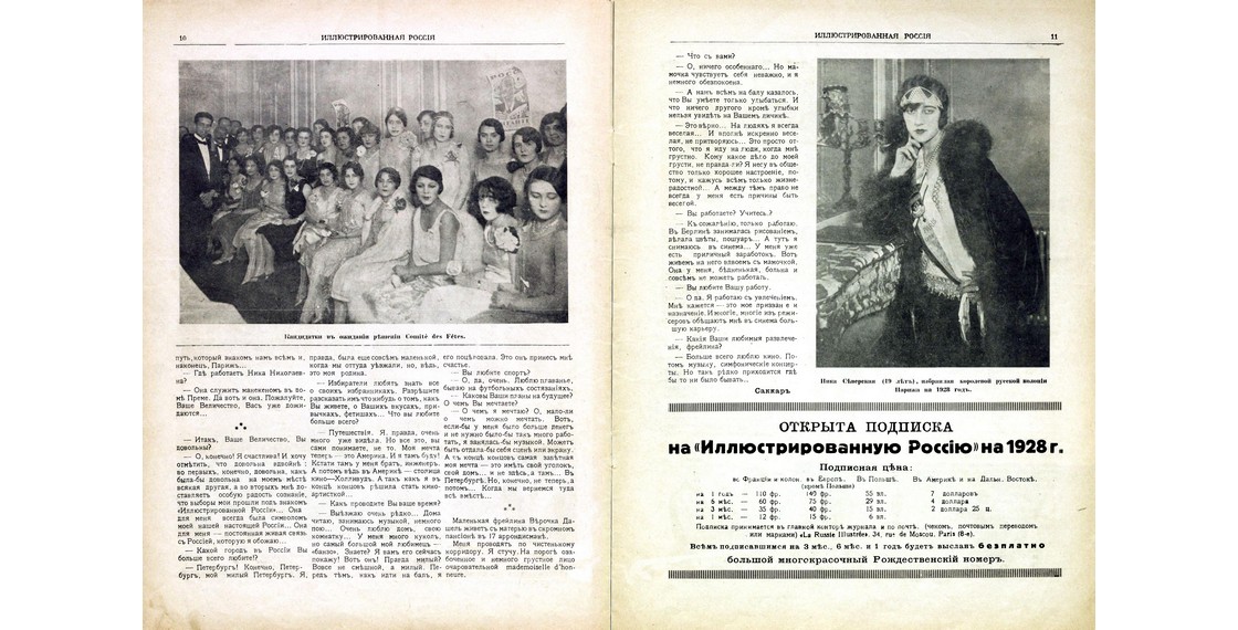 Интервью с Никой Прокофьевой-Северской из статьи, посвященной ее избранию королевой русской колонии Парижа (Иллюстрированная Россия. 1928. № 3). Книжное собрание ДРЗ