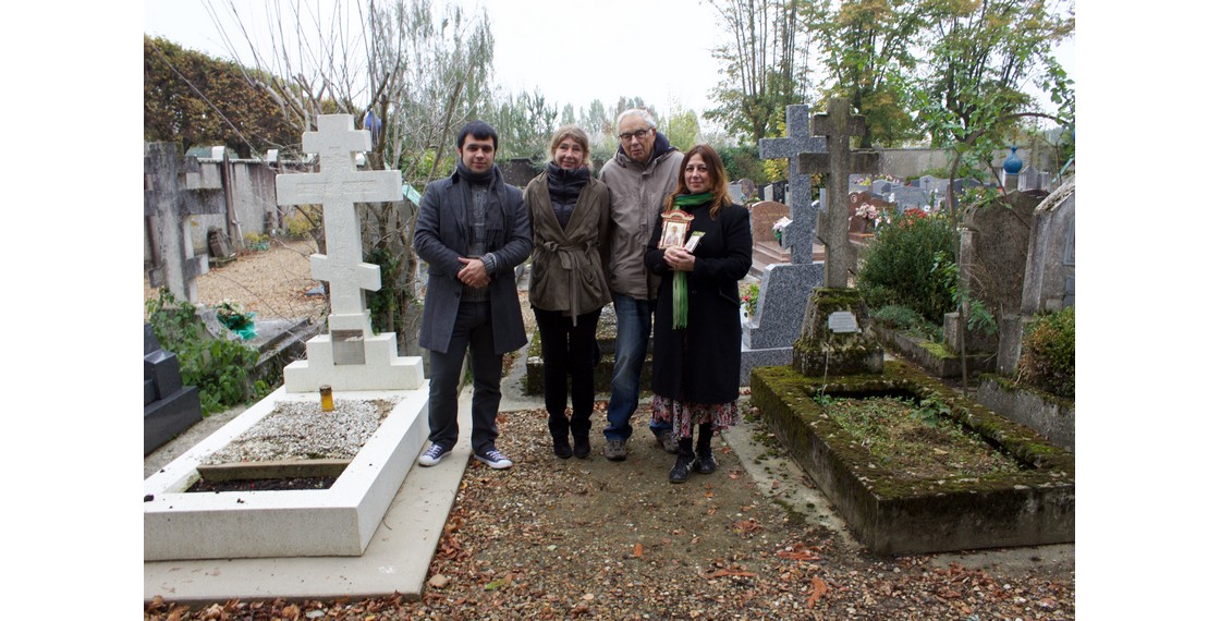 Потомки рода Прокофьевы-Северских — Михаил Павлов, Софья Прокофьева, Никита Прокофьев, Ирина Павлова — у могилы Варвары Григорьевны Прокофьевой-Северской (урожденной Лелеко) на кладбище в Сент-Женевьев-де-Буа (Франция). 2010-е. Архив И.Павловой