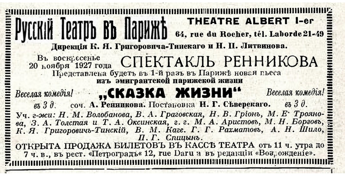 Анонс спектакля «Сказка жизни» в постановке Н.Г.Прокофьева-Северского (Иллюстрированная Россия. 1927. № 47). Книжное собрание ДРЗ